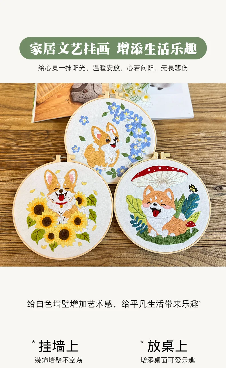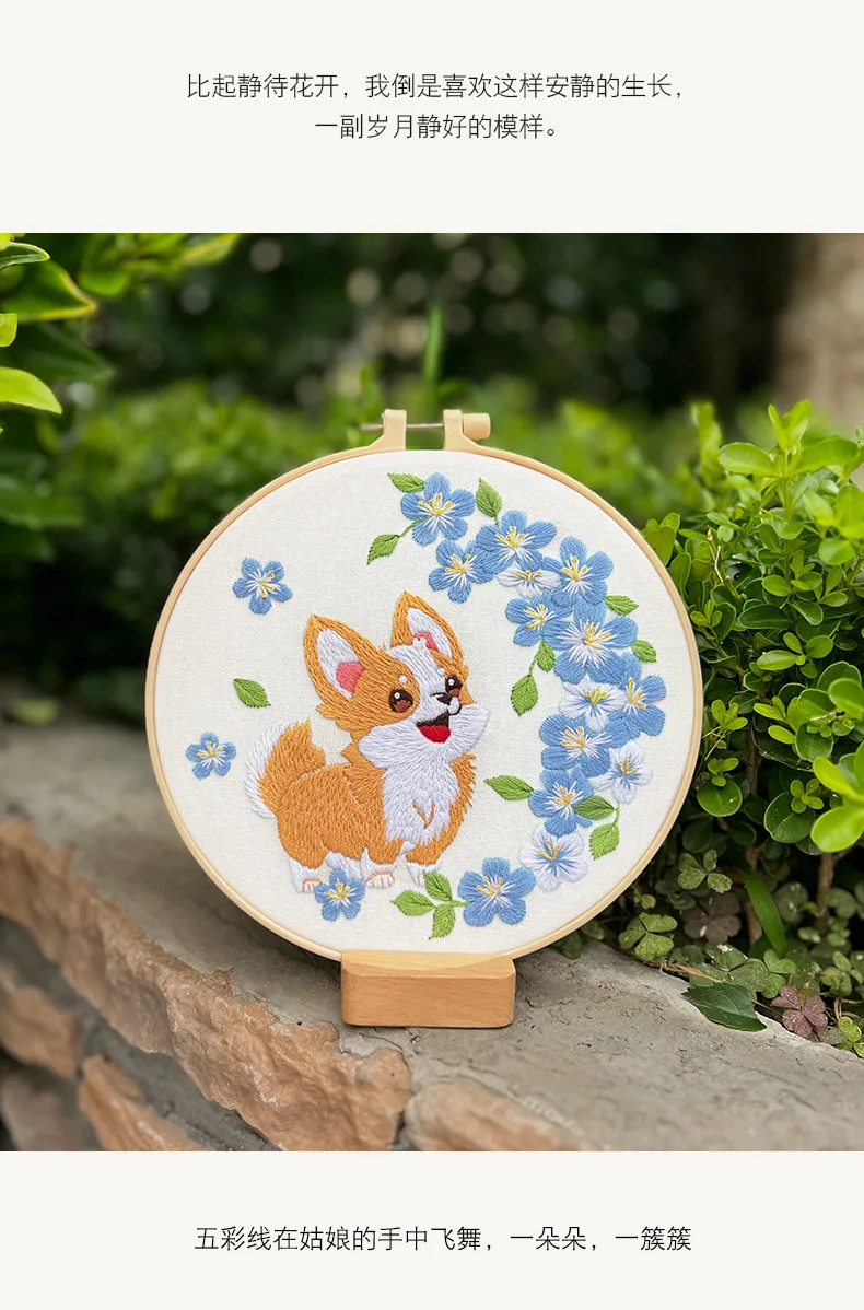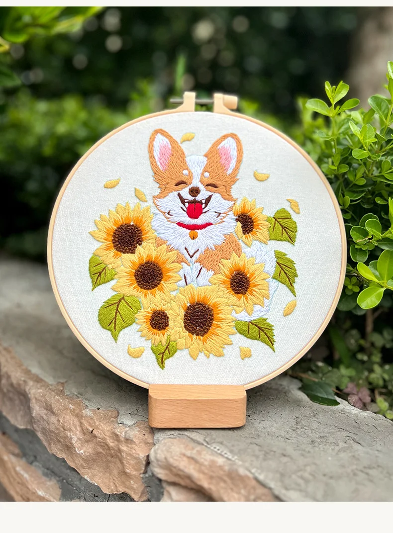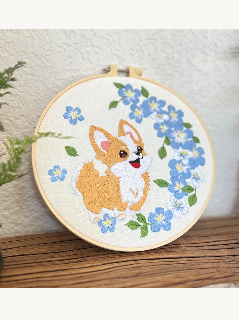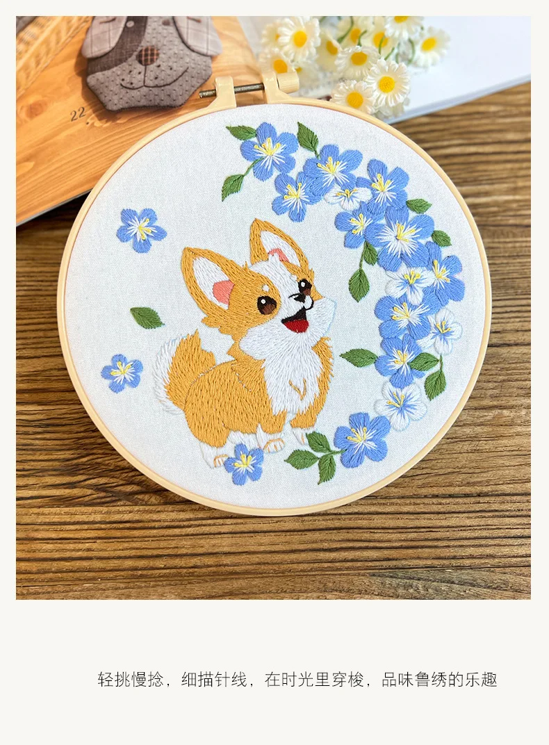 Flower Dog Embroidery Kit for Adults Kids Beginners Hand Embroidery Starter Kit Counted Stamped Cross Stitch Needlepoint Kit