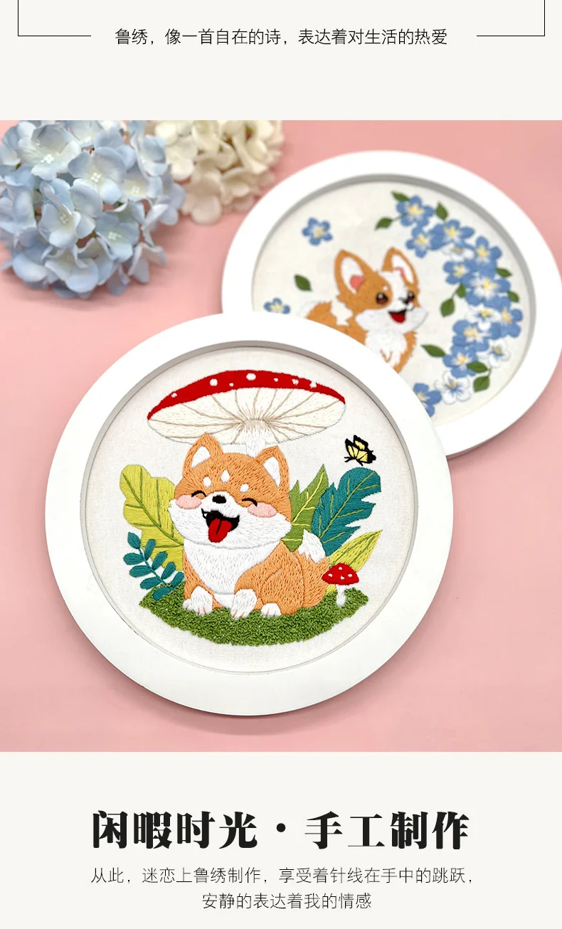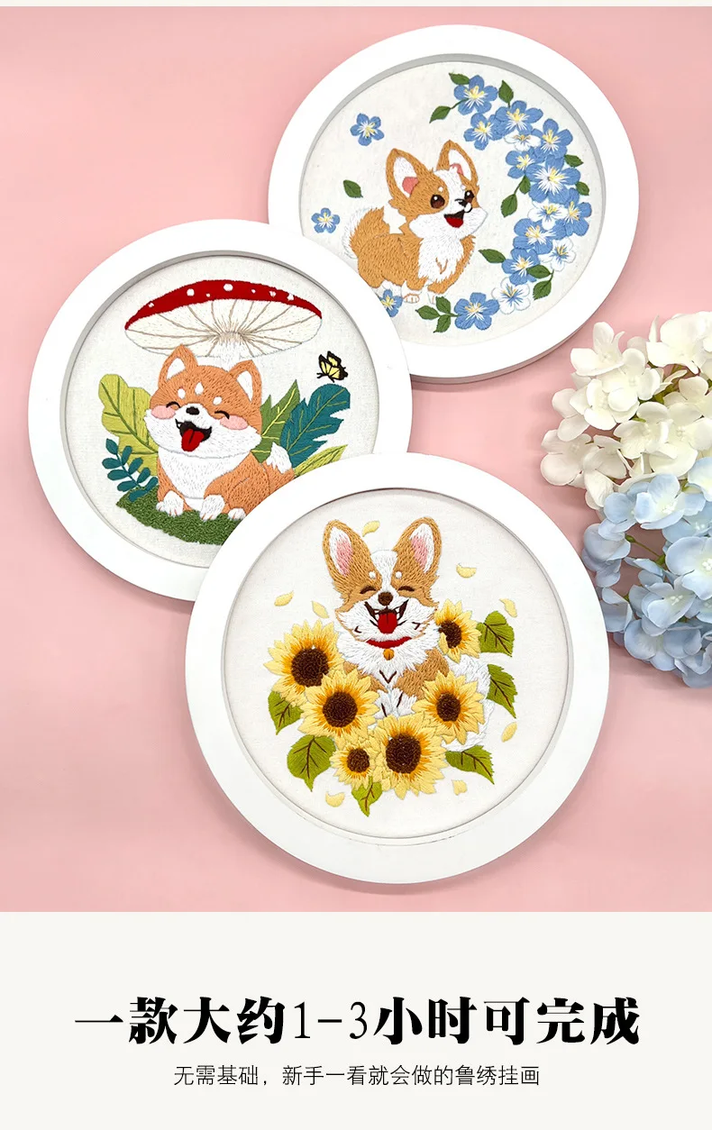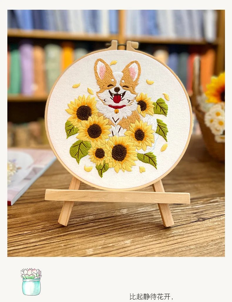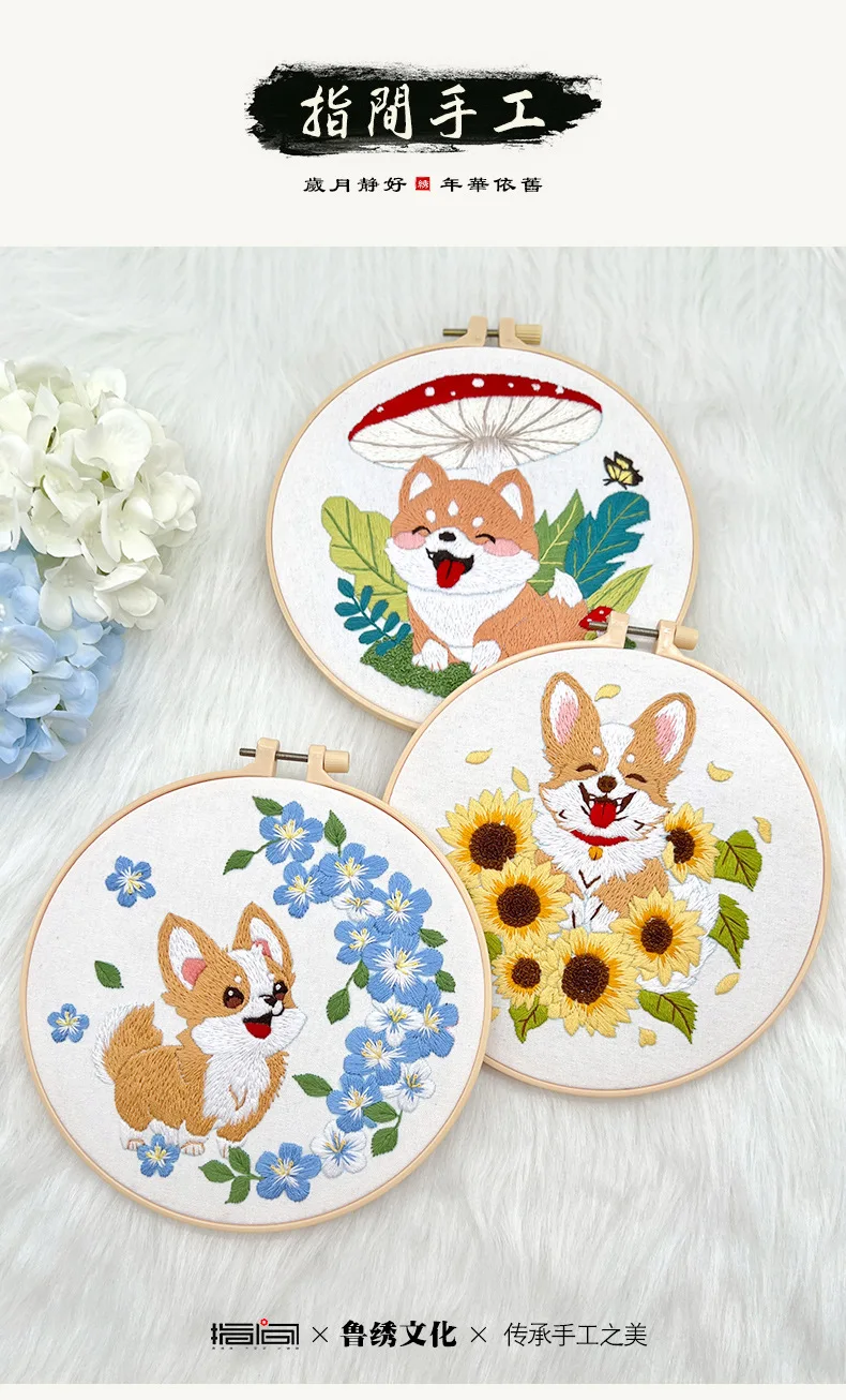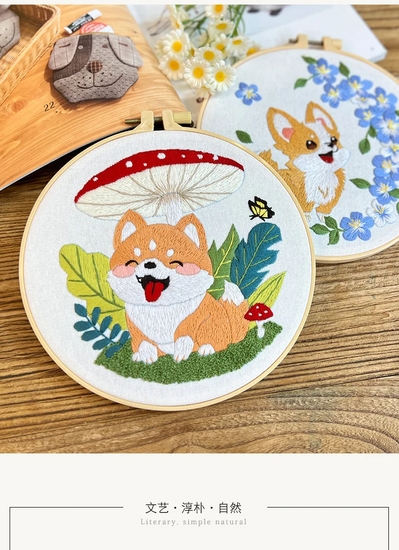 Flower Dog Embroidery Kit for Adults Kids Beginners Hand Embroidery Starter Kit Counted Stamped Cross Stitch Needlepoint Kit